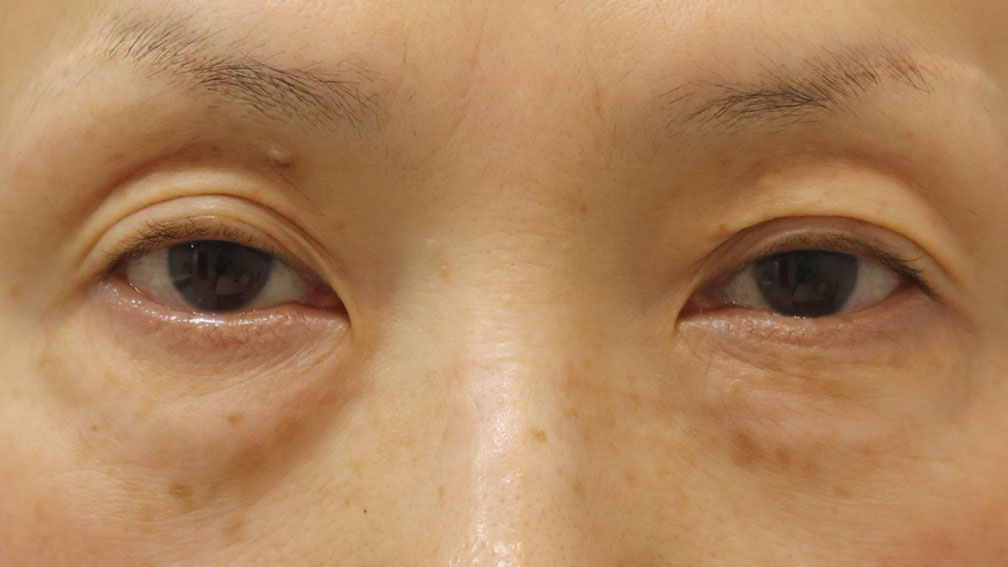 50代 目の下の膨らみが強い方です。膨らみがなくなれば年齢的にも皮膚のたるみが出るのは必発です。したがって、皮膚側から行……