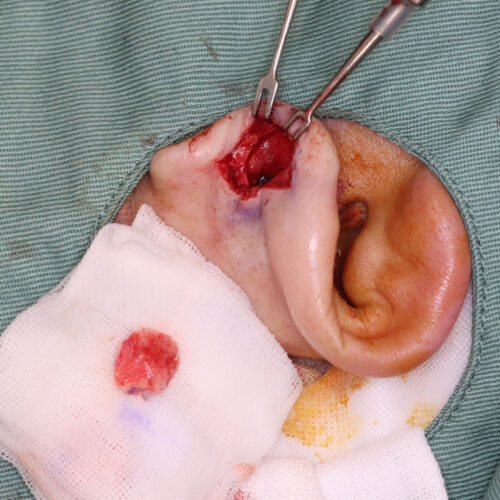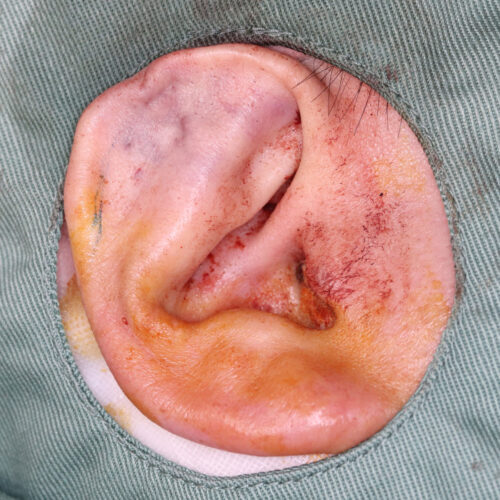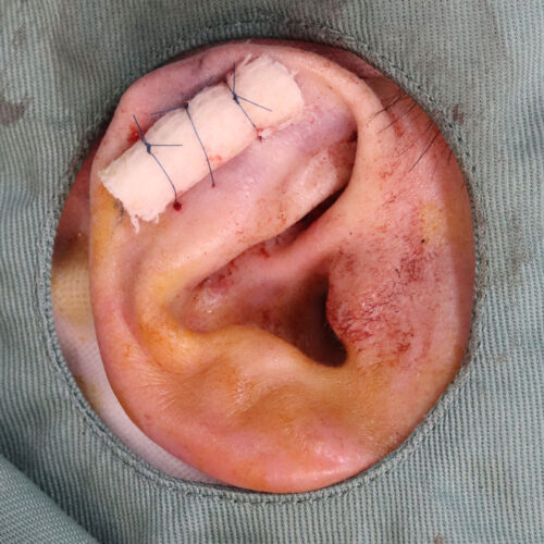 自然な耳のカーブを作るため今回は軟骨形成(軟骨戻し)で行いました。局所麻酔下にて手術時間は1時間。日帰り手術は可能ですが、下記の経過写真を見てもらえれば分かりますが、ボルスター固定といって戻した軟骨部に出血(血腫)が貯まらないように固定を行います。この状態でも翌日からシャワー浴は可能ですので心配はいりません。傷は耳の裏側に隠れますので傷跡で問題になることはありません。