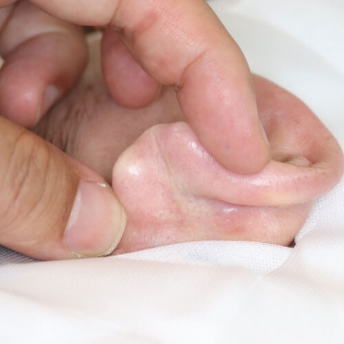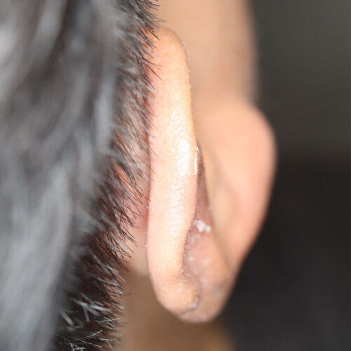 耳の後ろ側です。つまむとこのように後ろ側が凹んでしまいます。